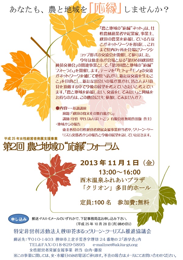 「第2回 農と地域の“応縁”フォーラム」が11月1日(金)に仙北市西木町の西木温泉ふれあいプラザ「クリオン」で開催されます。